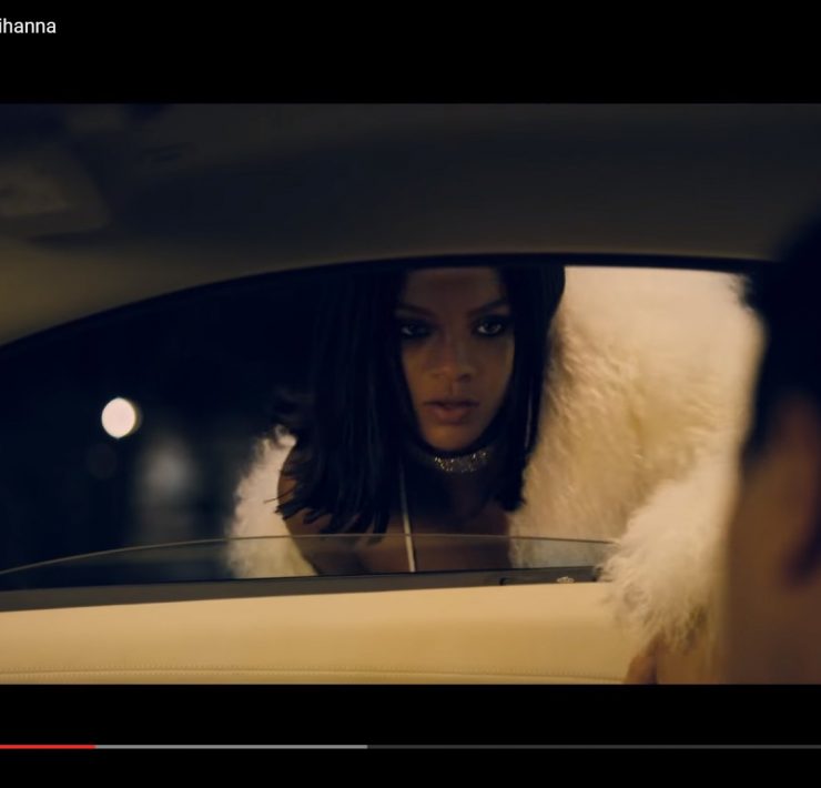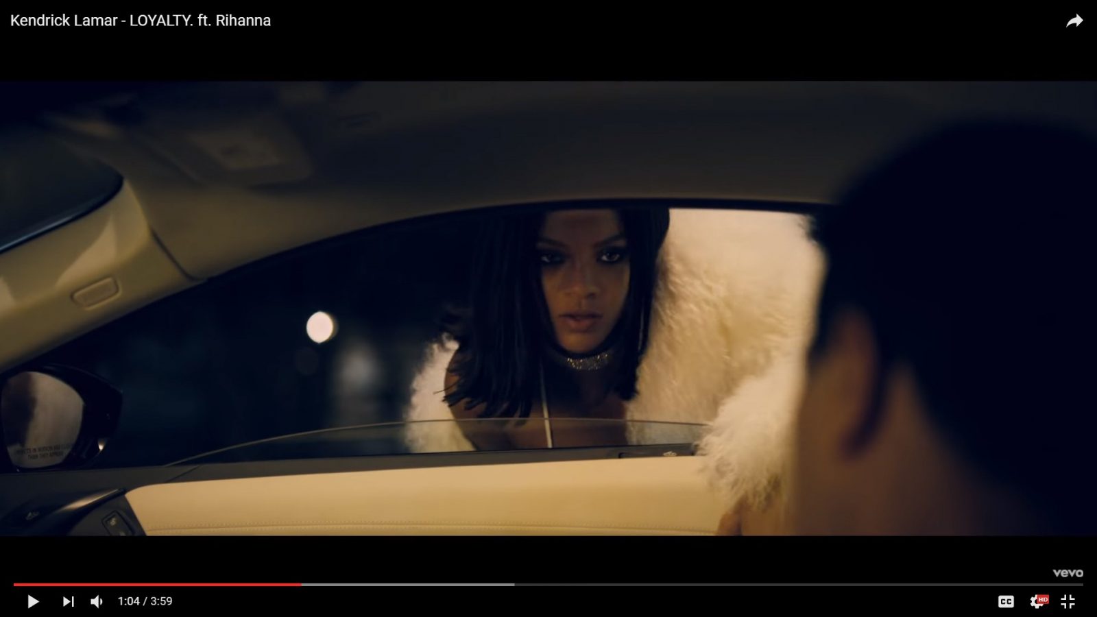 Rihanna wears an Adrienne Landau by Saulo Villela white Mongolian jacket in Kendrick Lamar’s new video LOYALTY Feat. Rihanna.
