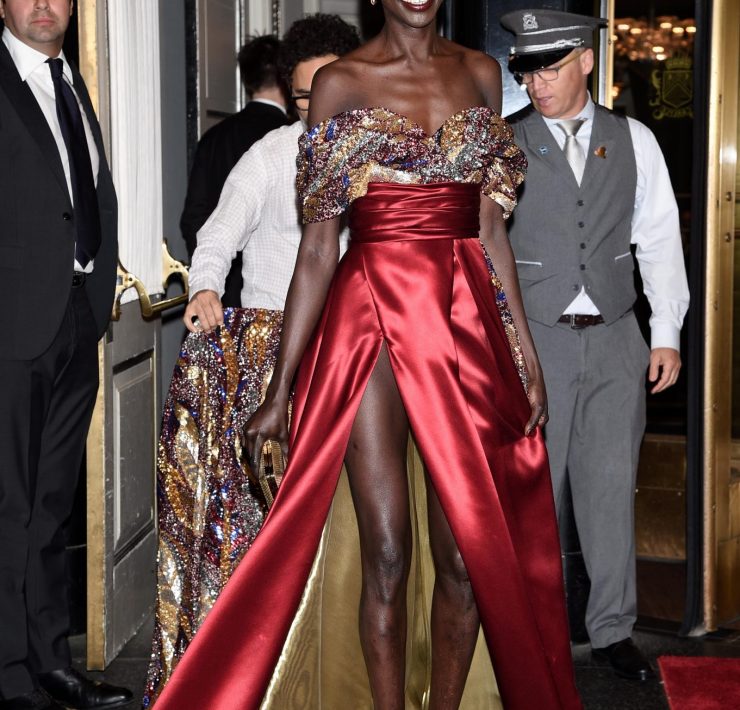 Model and actress Jasmine Sanders wore a voluminous gown of gold metal lamé. The gown was softly draped off the shoulder, then held by an elegant slim waist. The dress then released into a dramatic full silhouette, a high slit revealing Jasmine’s legs to emphasize the modern lightness.