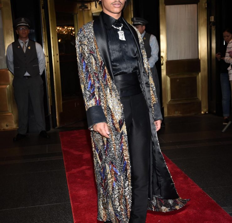 Model and influencer Luka Sabbat wore an extravagant robe entirely hand-embroidered with sequins. The intricate pattern was made from sequins in antique silver, deep red, burgundy, gold and royal blue, while the cuffs, shawl collar and lining were in black silk. Luka also wore tuxedo trousers made from sustainable materials organic silk, tencel, and wool.