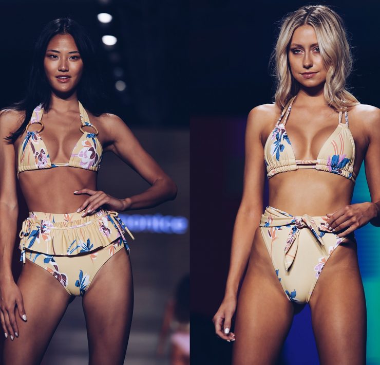 Florida based swimwear brand Montce, created by Alexandra Grief, showcased their latest collection at Miami Swim Week. The collection chock full of sugar and spice. Poppy reds, lavenders, yellows and whites set the tone for a refreshing color palette. Sweet floral and striped prints turned sexy on cinched, ruched and ruffled bikinis. Deep V’s and open backs graced one-pieces. High cut bottoms featured captivating cut-outs or playfully innocent ruffles. Wide-brimmed hats, mesh bags filled with lemons accessorized the looks. Sneakers made an appearance mixing in the right amount of tom-boy to these sweet looks.