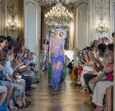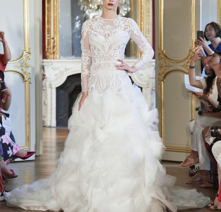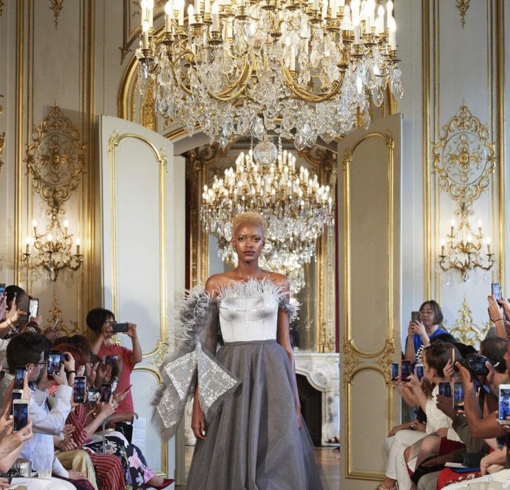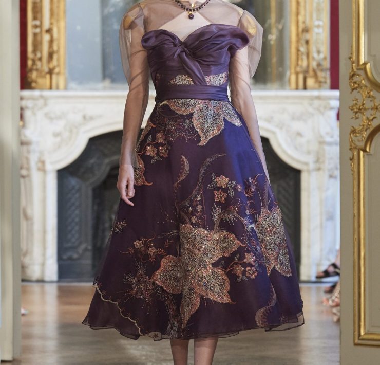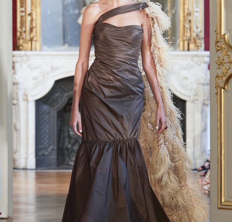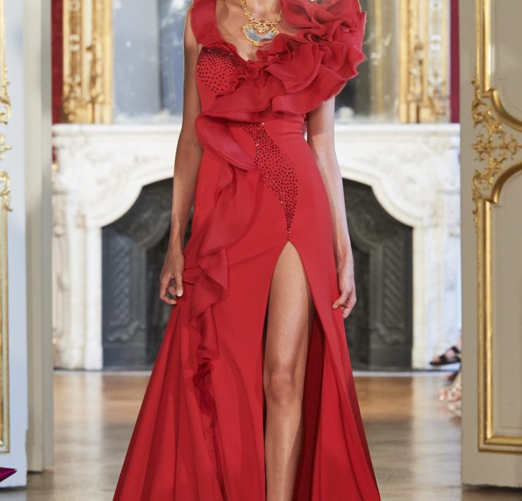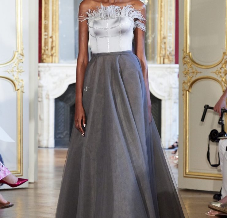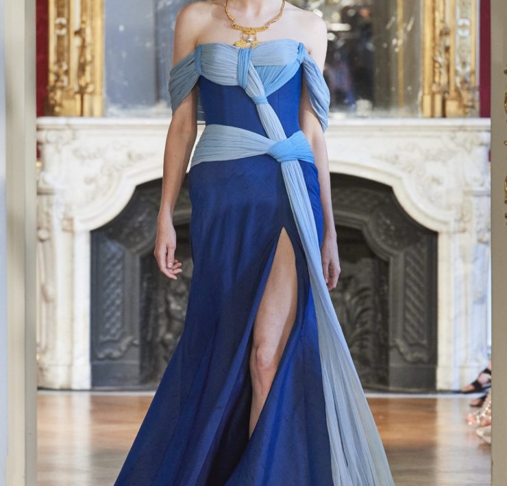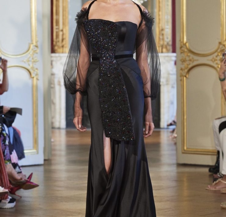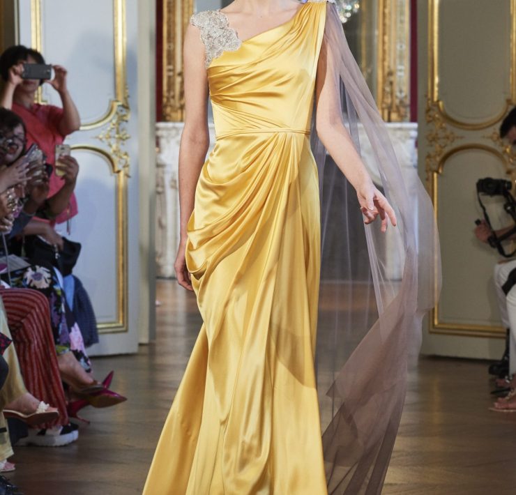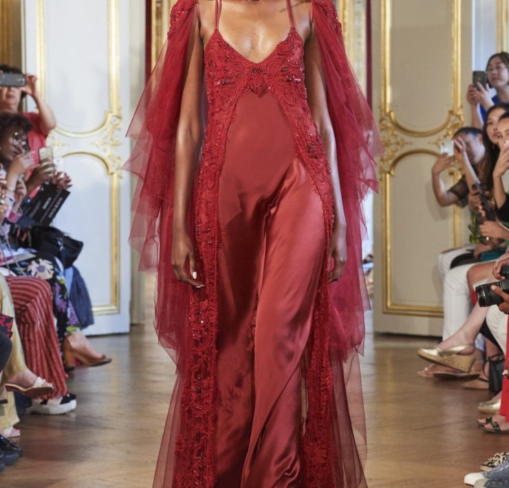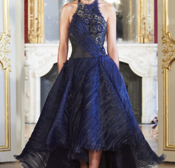 Working the grain of the fabric, using an angled cut, manipulating the fabric and creating a sumptuous drape, all contribute to creating a silhouette juxtaposing elements of design that will flatter and give power. Like a pilgrimage of nomads to exotic lands, our workshop uses traditional sewing techniques such as draping, ruching, pleating, picking, dyeing, molding, corsetry and hand-stitched finishing. Embroidery and pearls sublimate a luxurious cacophony of textures including Swarovski crystals, ostrich feathers, glass beads, and delicate threads.