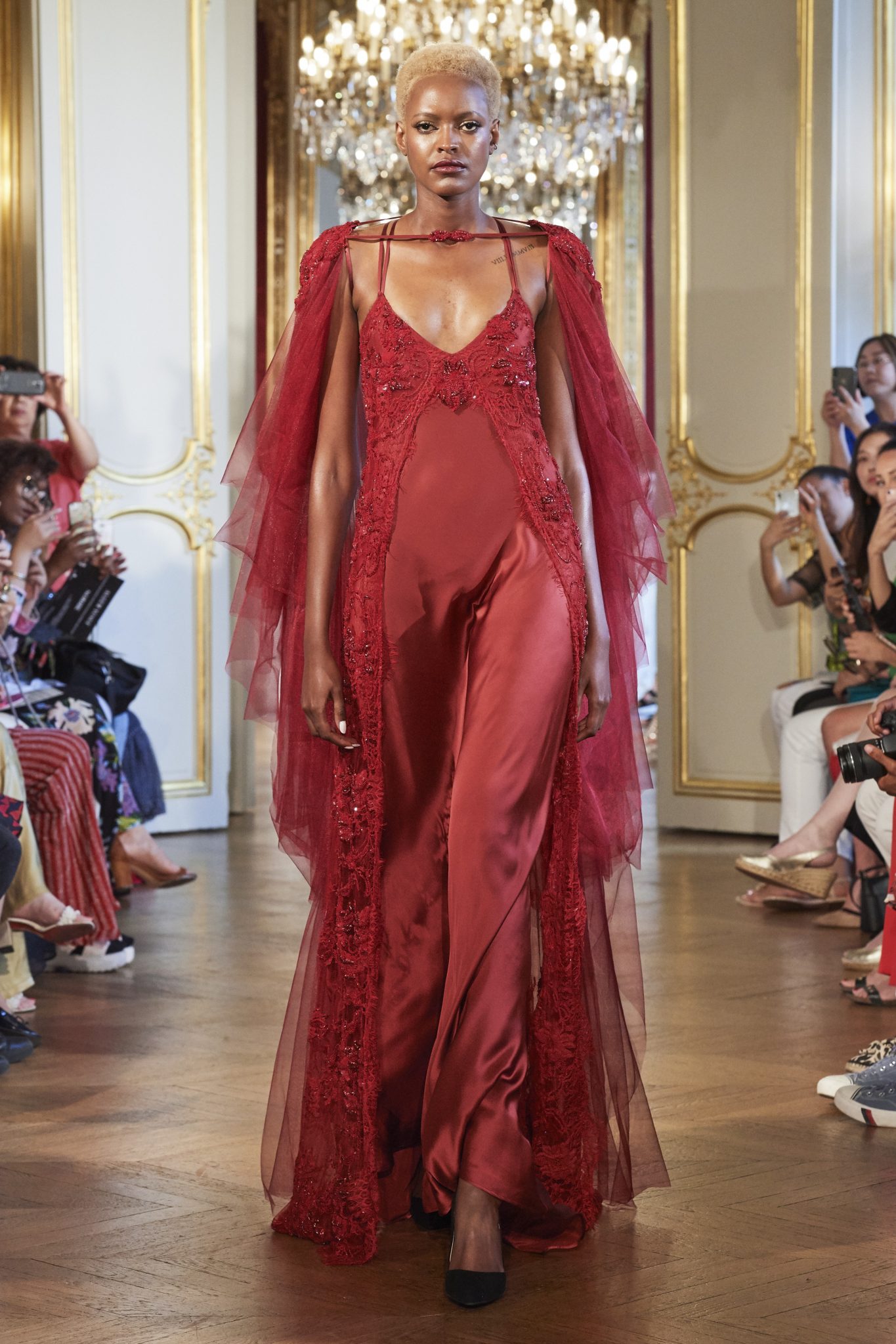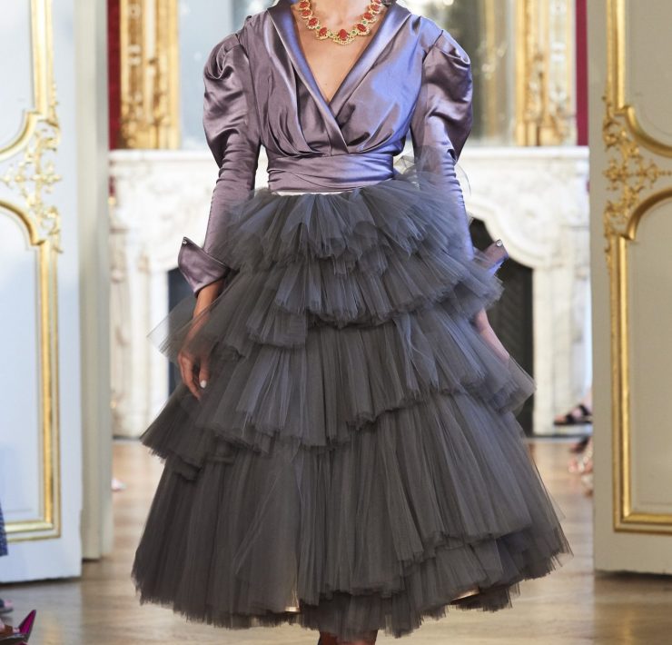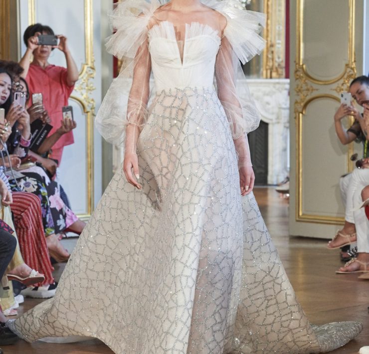 Fabrics make sense: rich silks – satins, crumpled muslin, dupion, taffeta, organza – as well as lurex blends evoking the slow ebb and flow of underwater love and the journey of clouds over vast expanses. Fabrics from around the world, including Sophie Hallette’s beautiful French lace, complete these idyllic dreams.