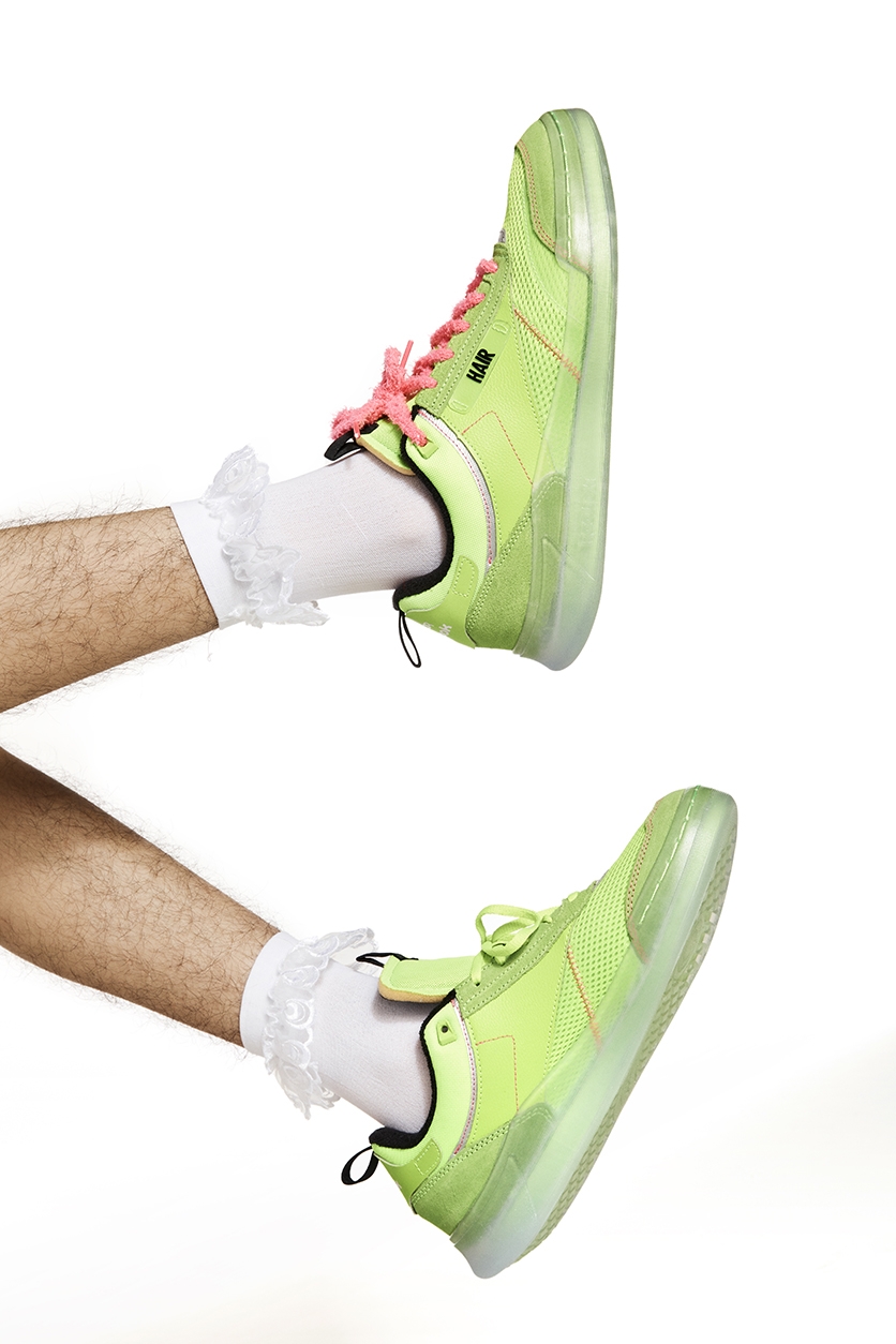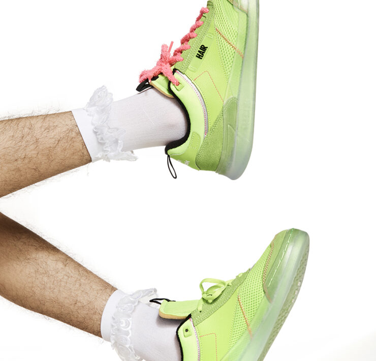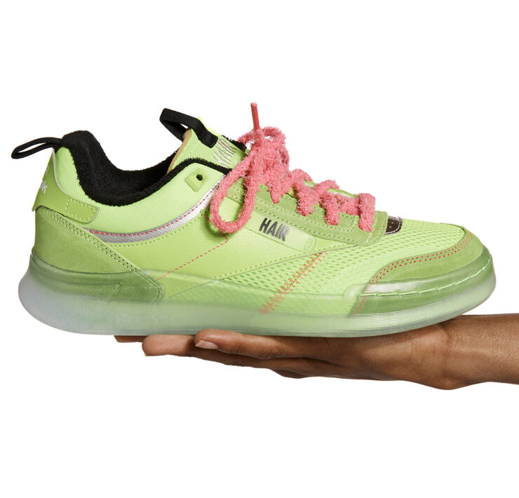 The second silhouette, the Club C Legacy ($100), features a bright solar green and pink color palette. “These colors represent the same feeling of hyper freedom that my hair art brings to my clients,” describes Moon. “They instantly go in your bloodstream and change your mood to a new tier of exaggerated fun.” The transparent materials incorporated within the shoe were inspired by the Major Apron, Daniel Moon’s fashionable, functional apron used by hairdressers across the globe. Both the Club C Legacy and Classic Leather Legacy will also include one pair of fuzzy laces, inspired by Moon’s hair experience.