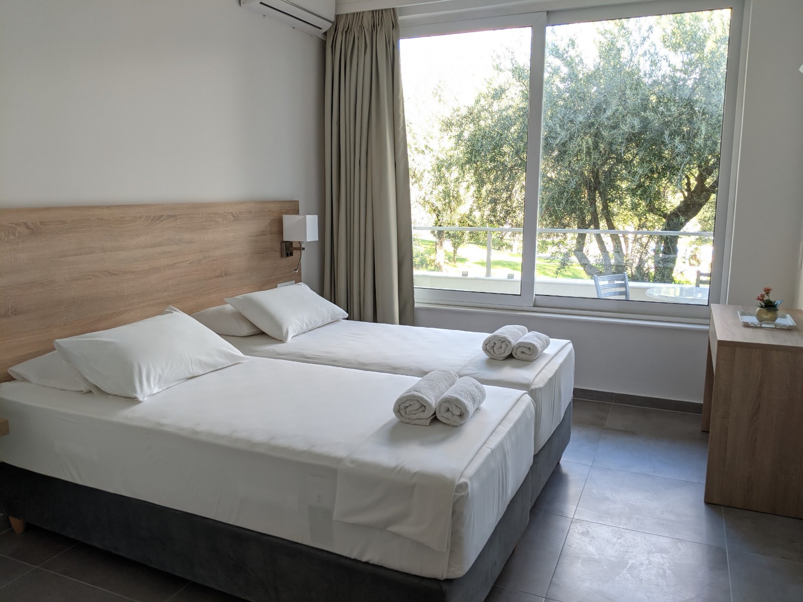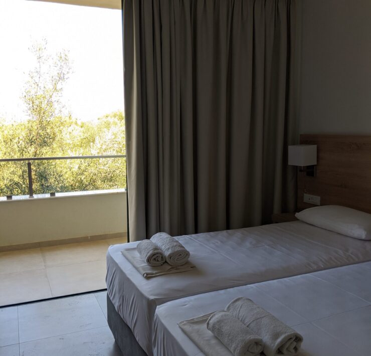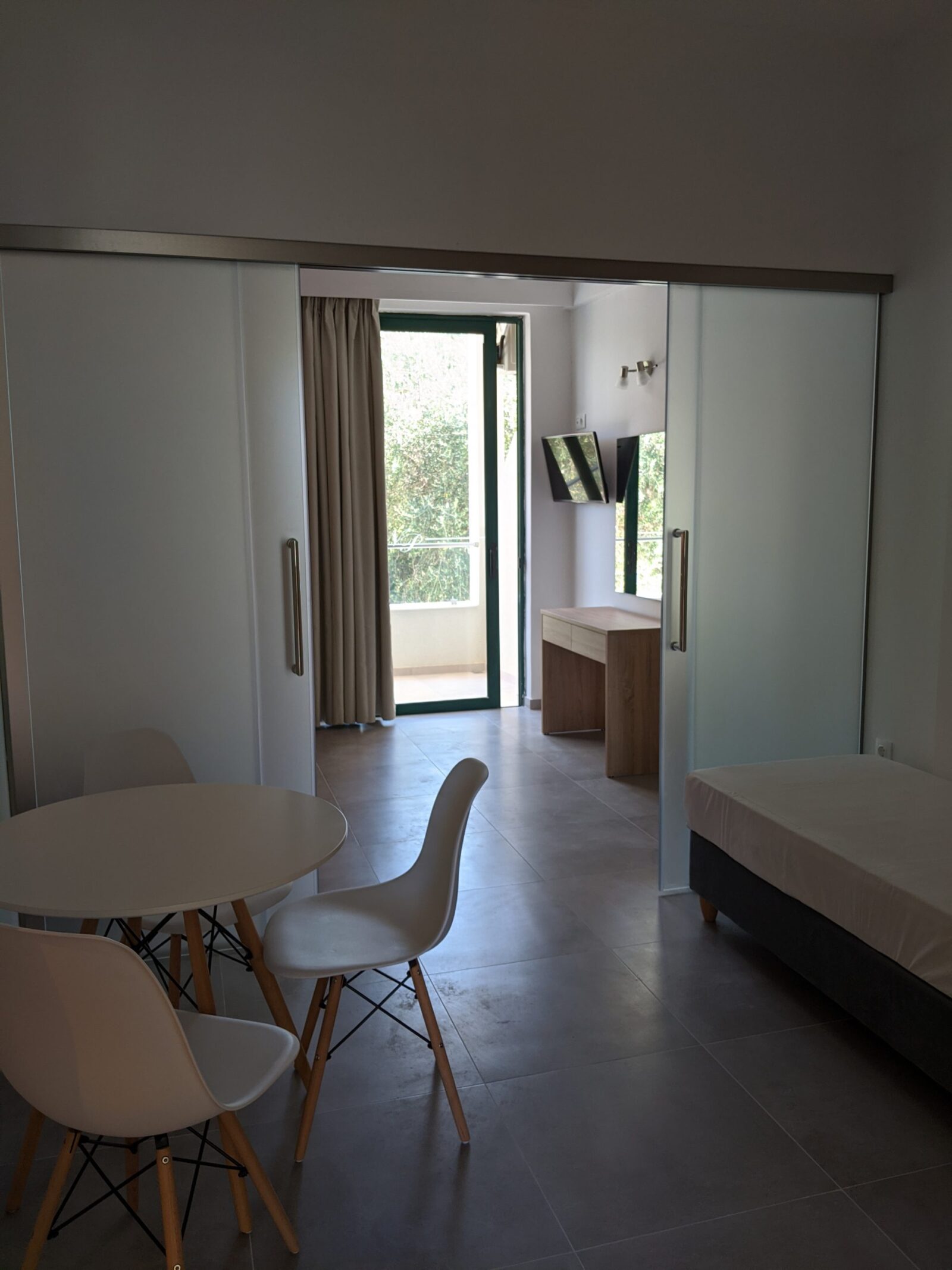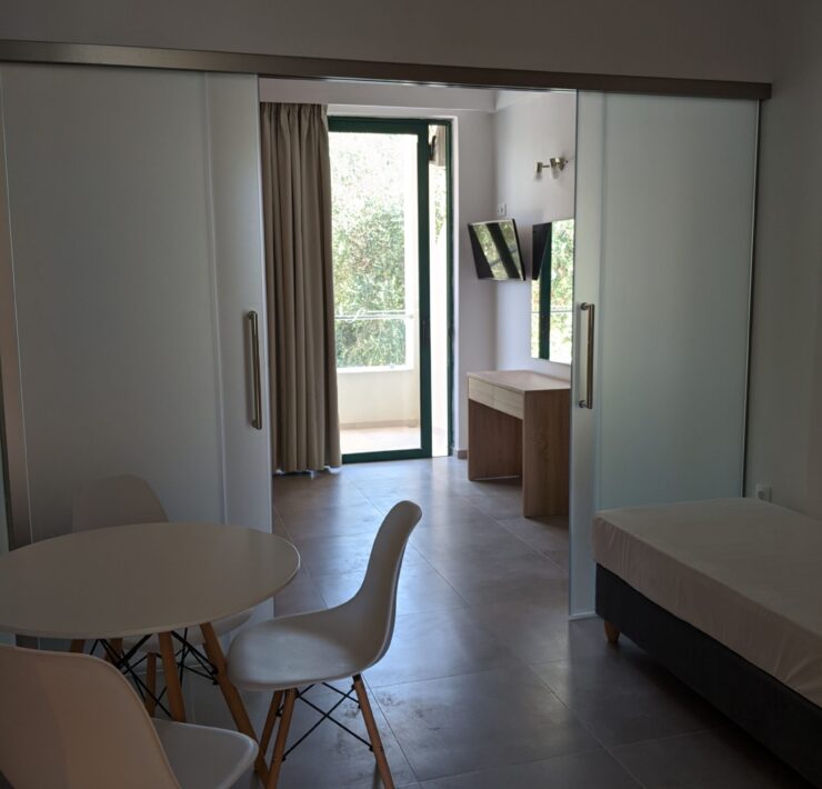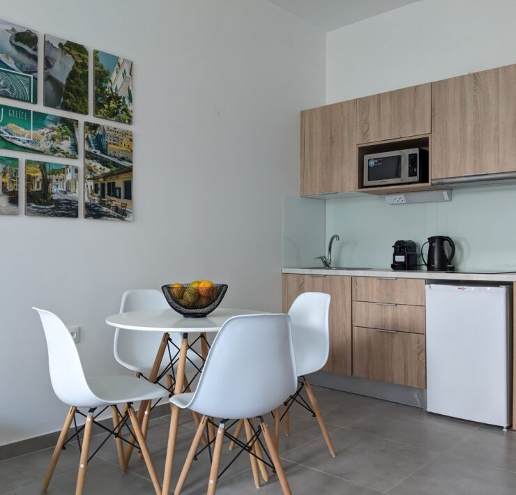 Accommodation-wise, the stylish studio apartments offer ample living space, a modern bathroom with a walk-in shower, a fully equipped kitchenette and dining area, and of course, a balcony that either overlooks the gardens and the pool or the hills.