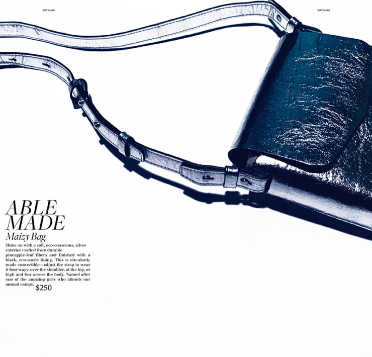 Shine on with a soft, eco-conscious, silver exterior crafted from durable pineapple-leaf fibers and finished with a black, eco-suede lining. This is circularity made convertible—adjust the strap to wear it four ways: over the shoulder, at the hip, or high and low across the body. Named after one of the amazing girls who attends our annual camps.