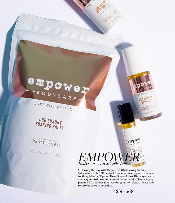Body Care / Luxe Collection Melt away the day with Empower® CBD Luxury Soaking Salts, made with CBD derived from organically grown hemp, a soothing blend of Epsom, Dead Sea and pink Himalayan salts and a synergistic combination of essential oils. These highly potent CBD soaking salts are designed to relax, hydrate and restore balance to your skin.