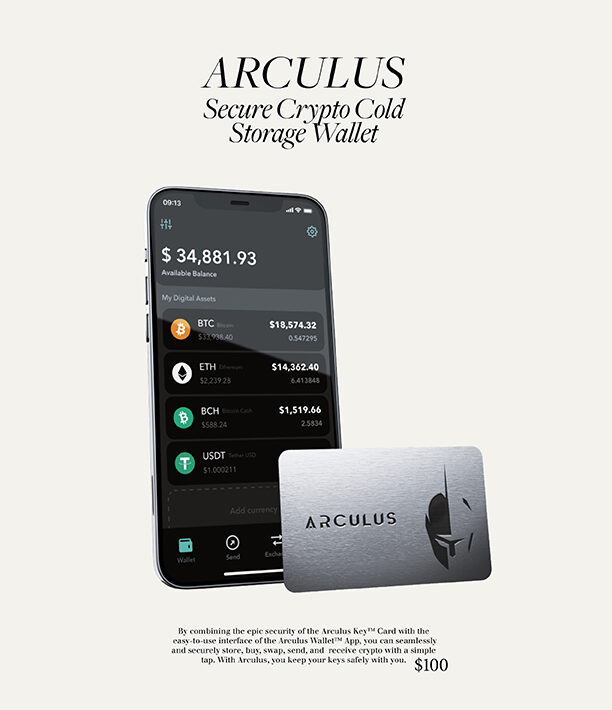 Secure Crypto Cold Storage Wallet By combining the epic security of the Arculus Key™ Card with the easy-to-use interface of the Arculus Wallet™ App, you can seamlessly and securely store, buy, swap, send, and receive crypto with a simple tap. With Arculus, you keep your keys safely with you