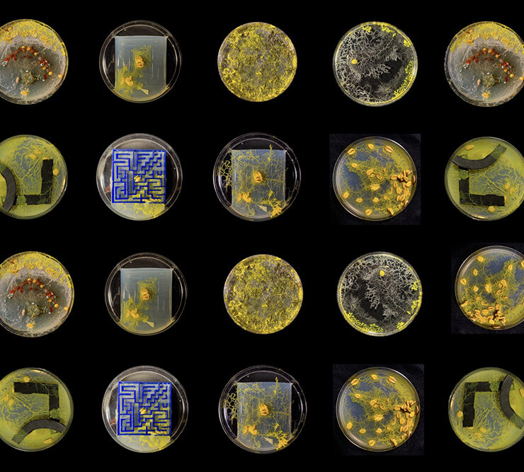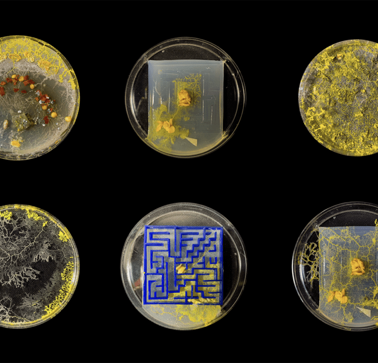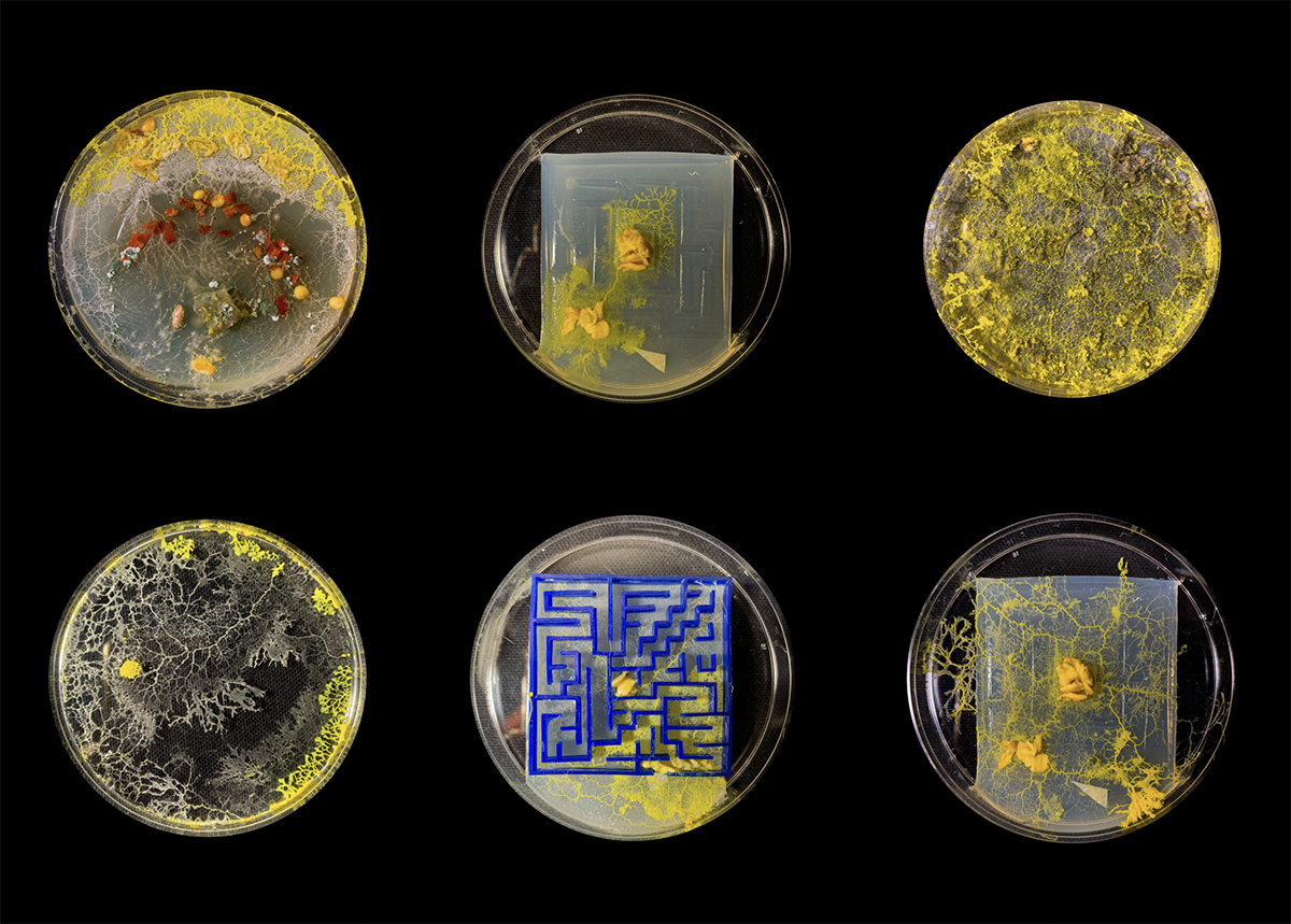 Slime Brain by Mehek Vohra 24 GD and Manini Banerjee 23 ID. These students, as part of Paula Gaetano-Adi’s Robotics for the Pluriverse course, explore bio-intelligence of single-cell organisms and how slime mold uses chemotaxis to navigate towards stimuli, imagining the potential for organic matter to drive autonomous vehicles