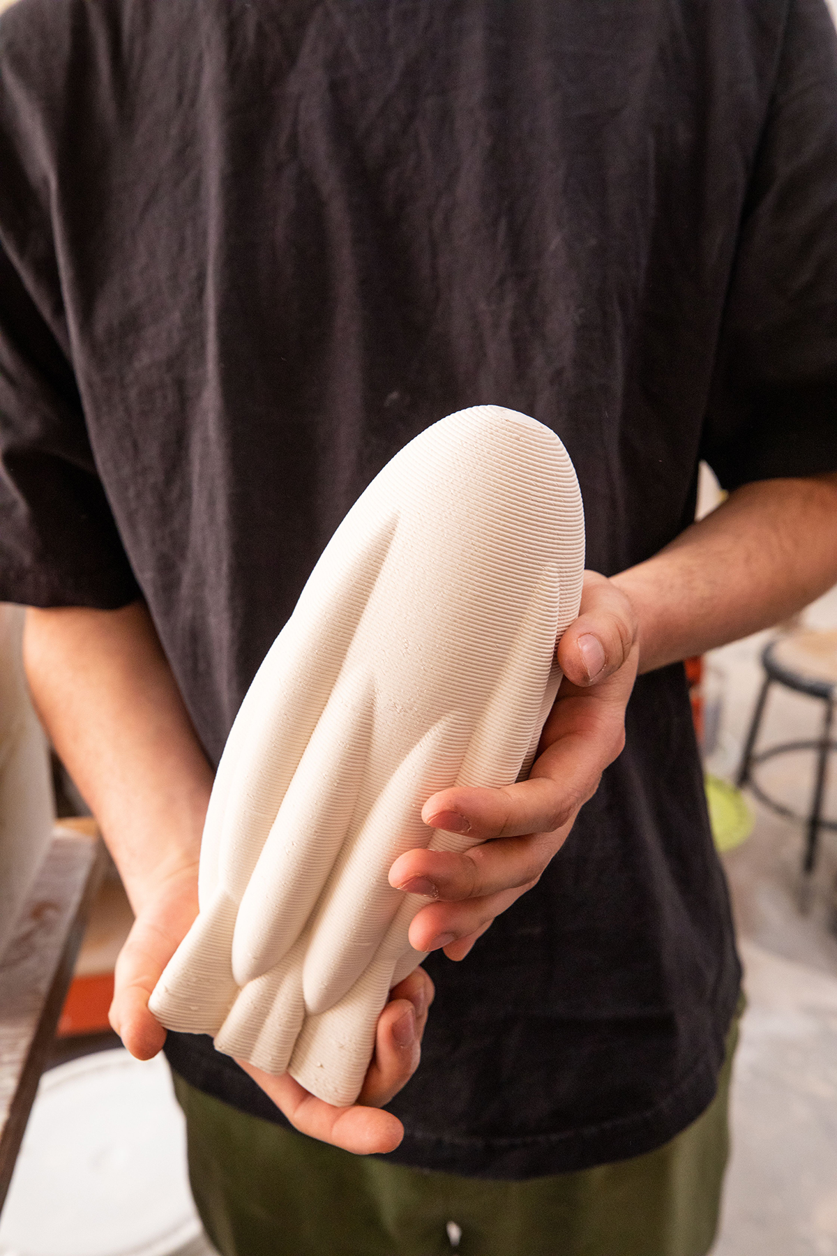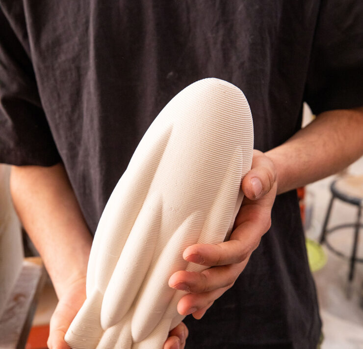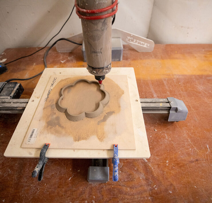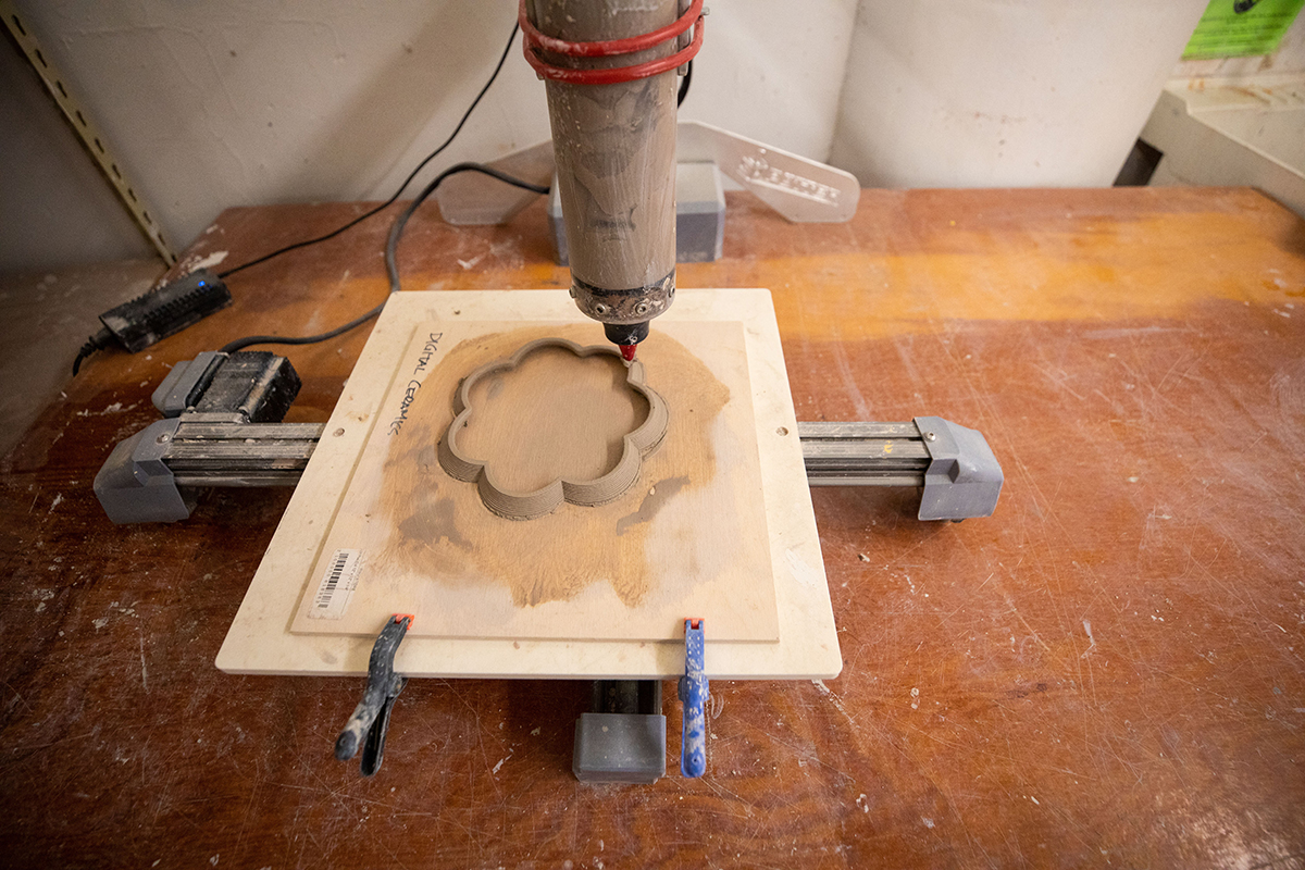 The Digital Ceramics research studio explored the use of cutting-edge technologies to produce forms composed of both traditional and new potential materials, such as salt, sand, sawdust, and coffee grounds, with an emphasis on sustainability. Modeling applications, including 3D scanning in collaboration with the Nature Lab, have been used to produce forms that can be fabricated by additive technologies. These technologies include paste clay extrusion and the use of experimental sustainable materials. Students worked with an open-source printer to gain a better understanding of how shared technology leads to unexpected connections and creative ways of making.