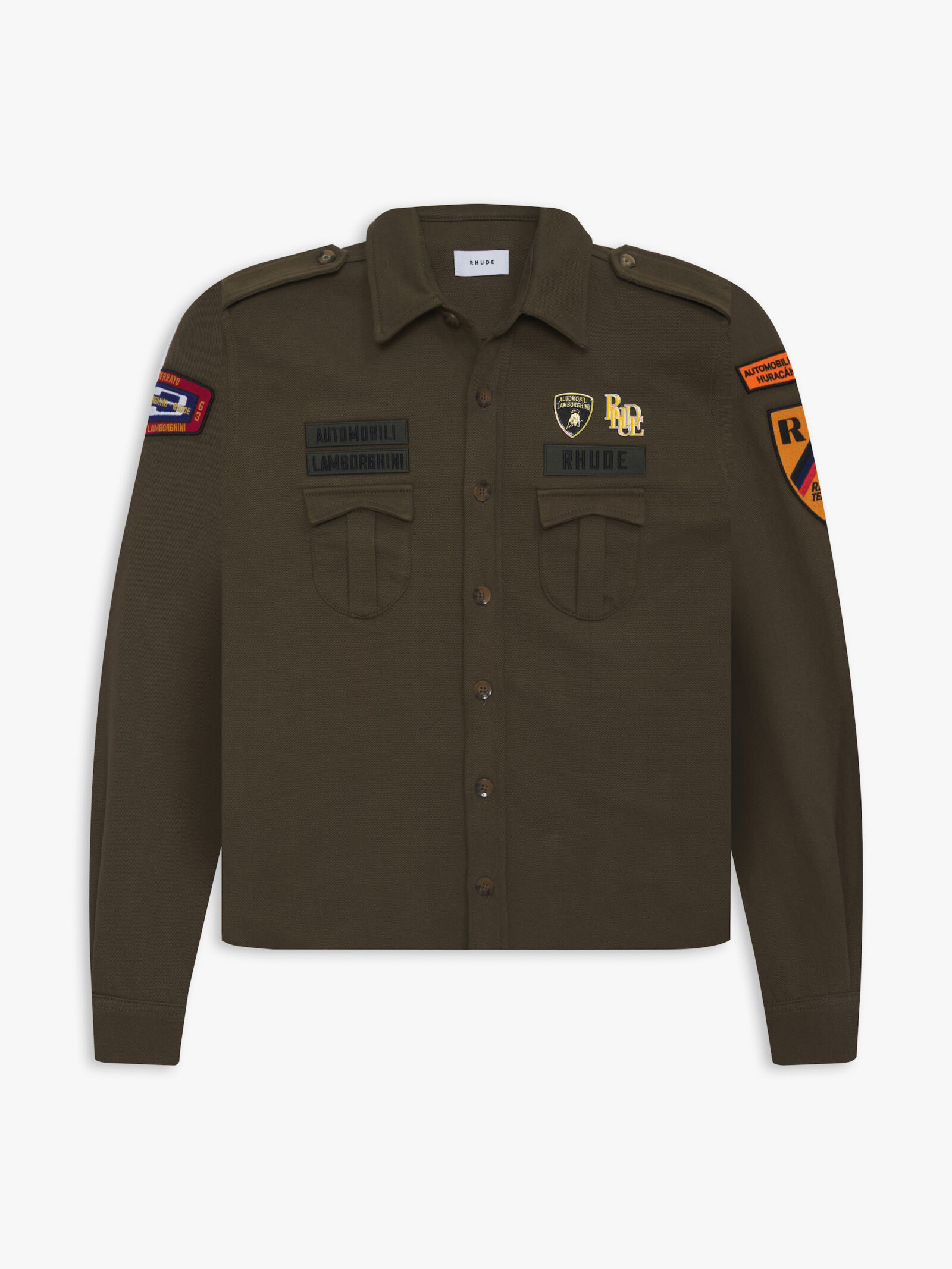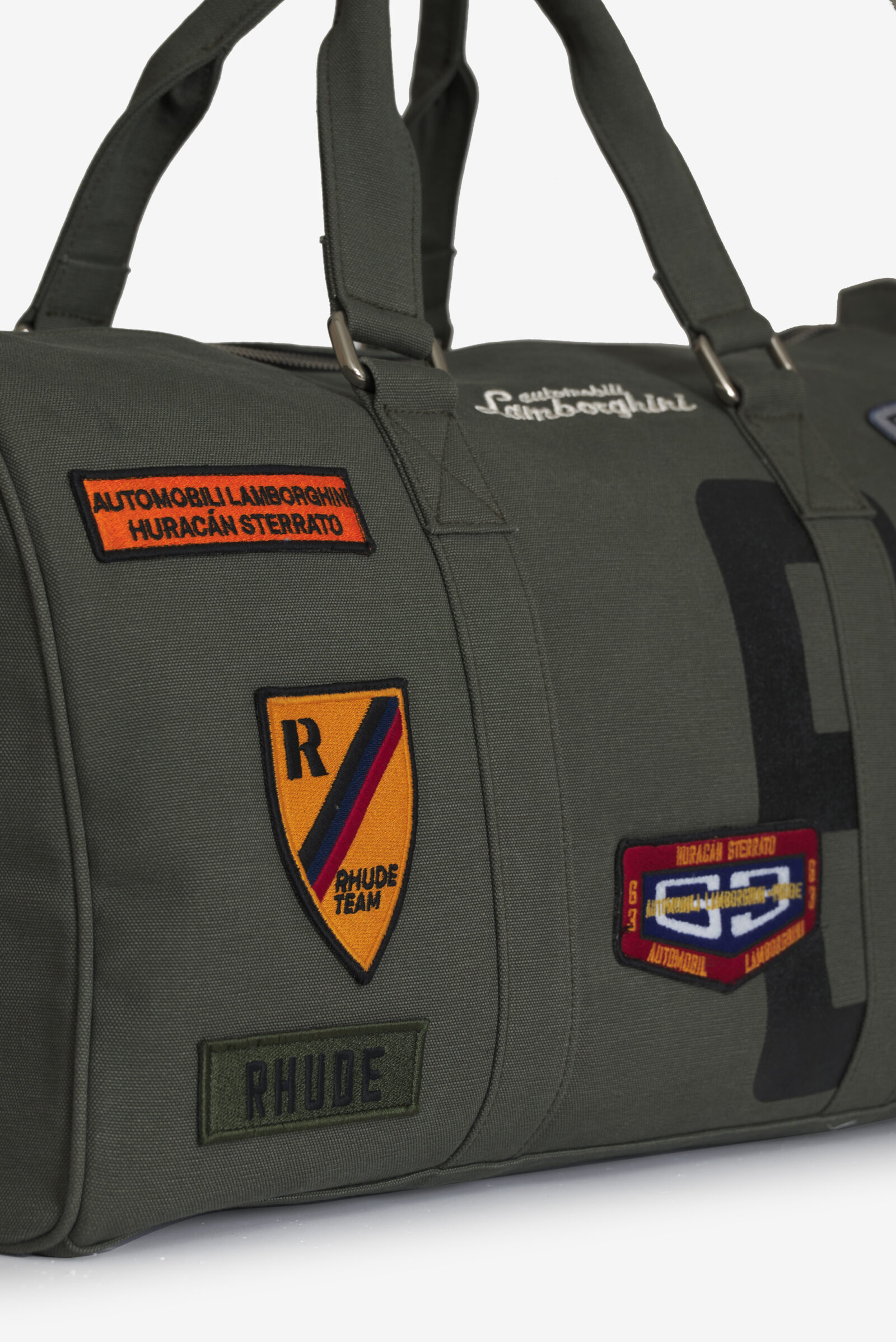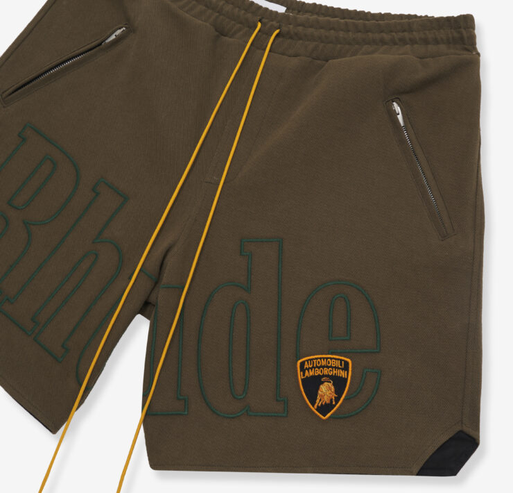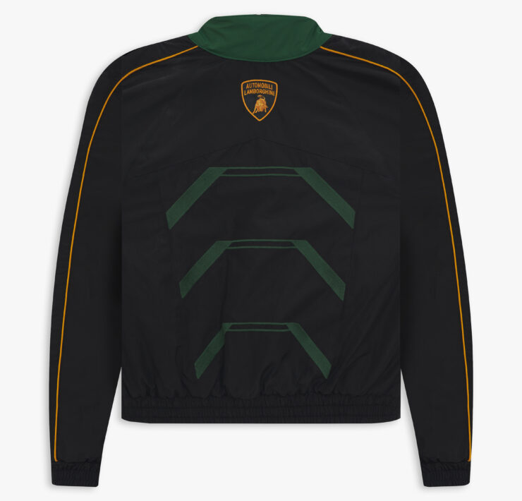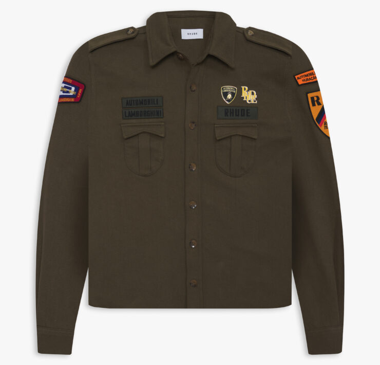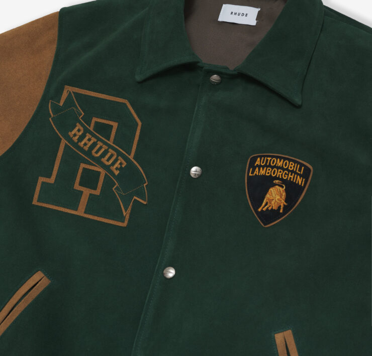 The capsule features jackets, cargo pants, polo shirts, tees, flat-brim hats, “soft toolbox” duffels, and more. It fuses influences from different cues, melding a military surplus aesthetic–with a focus on canvases and twills–and direct links to Lamborghini’s automotive legacy. Vent-mimicking details on the back of a half-zip anorak. Inspired by the lines on Lamborghini’s original Countach model, produced from 1974 to 1990, and those on the Huracán Sterrato. An aviator jacket features patches with Rhude and Lamborghini’s iconography, while a varsity jacket boldly spells out “Automobili Lamborghini” across the shoulders.