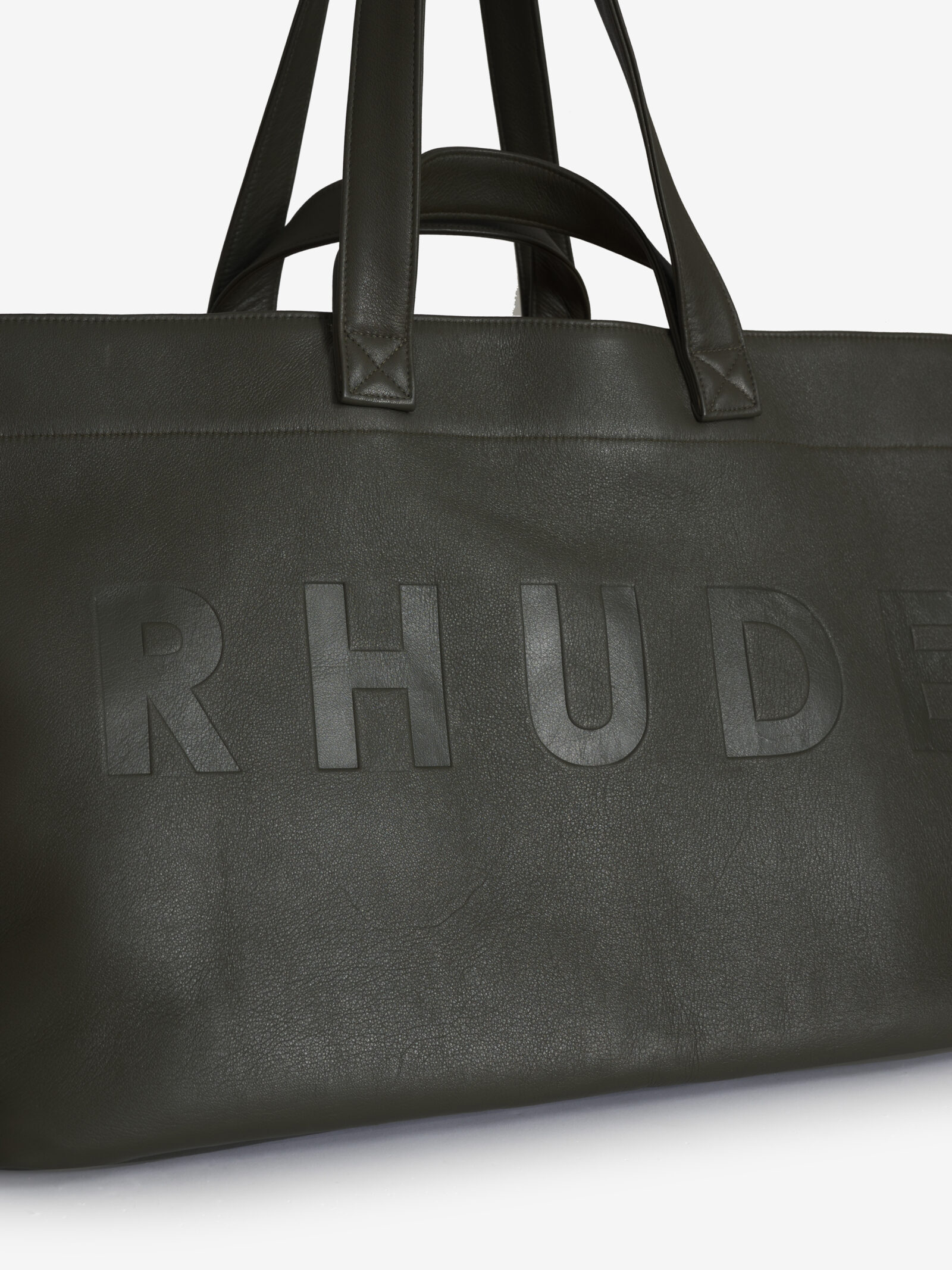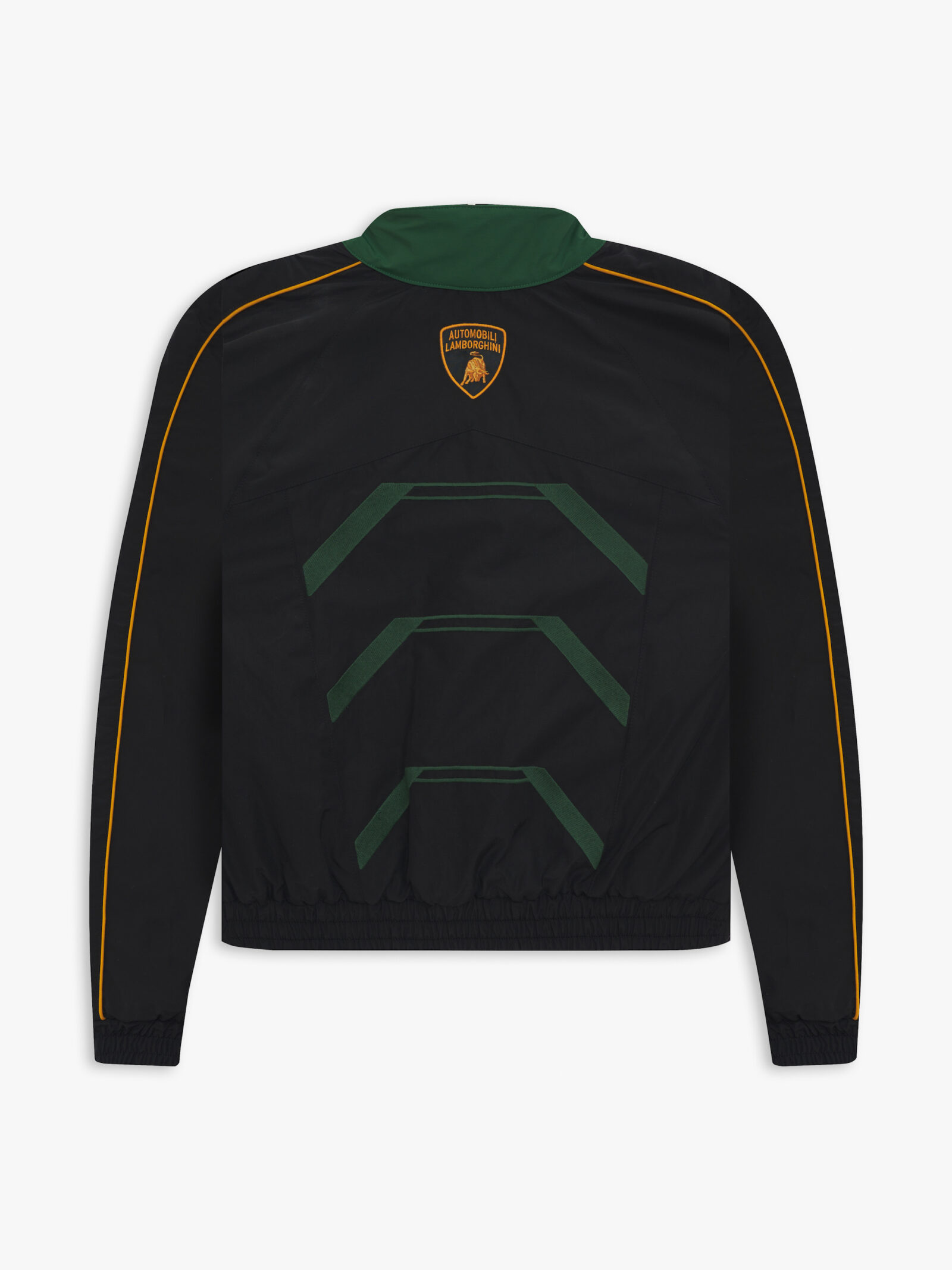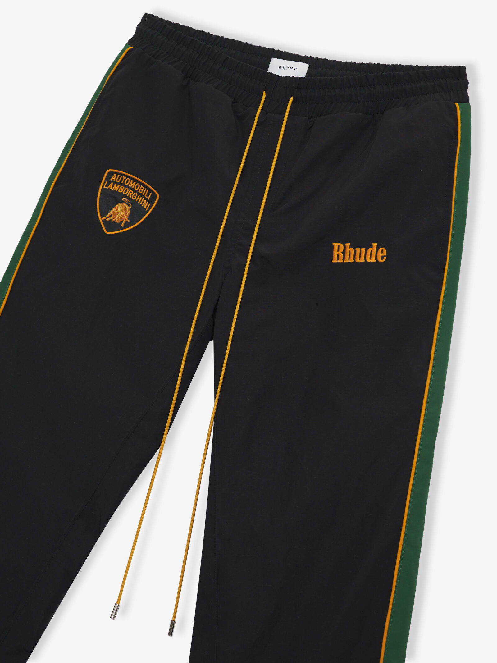 The capsule features jackets, cargo pants, polo shirts, tees, flat-brim hats, “soft toolbox” duffels, and more. It fuses influences from different cues, melding a military surplus aesthetic–with a focus on canvases and twills–and direct links to Lamborghini’s automotive legacy. Vent-mimicking details on the back of a half-zip anorak. Inspired by the lines on Lamborghini’s original Countach model, produced from 1974 to 1990, and those on the Huracán Sterrato. An aviator jacket features patches with Rhude and Lamborghini’s iconography, while a varsity jacket boldly spells out “Automobili Lamborghini” across the shoulders.